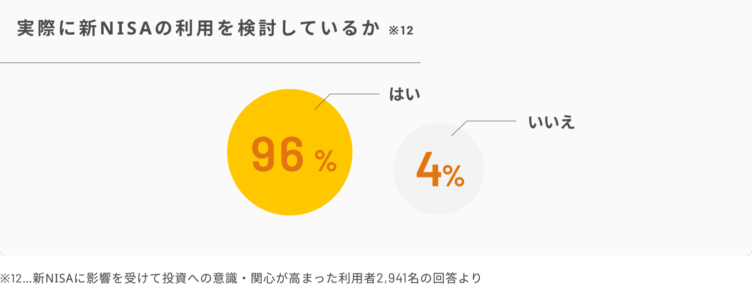 2023年は、昨年と比べるとより一層【投資】という言葉を耳にする一年だったのではないでしょうか。2022年4月より高校の家庭科の授業で資産形成の授業がスタートし、2024年1月からは「新NISA」が始まります。実際に新NISAを検討しているかで「はい」と答えた人は96%でした。投資は余剰資金から行い、目標を決めて行うことをお勧めします。