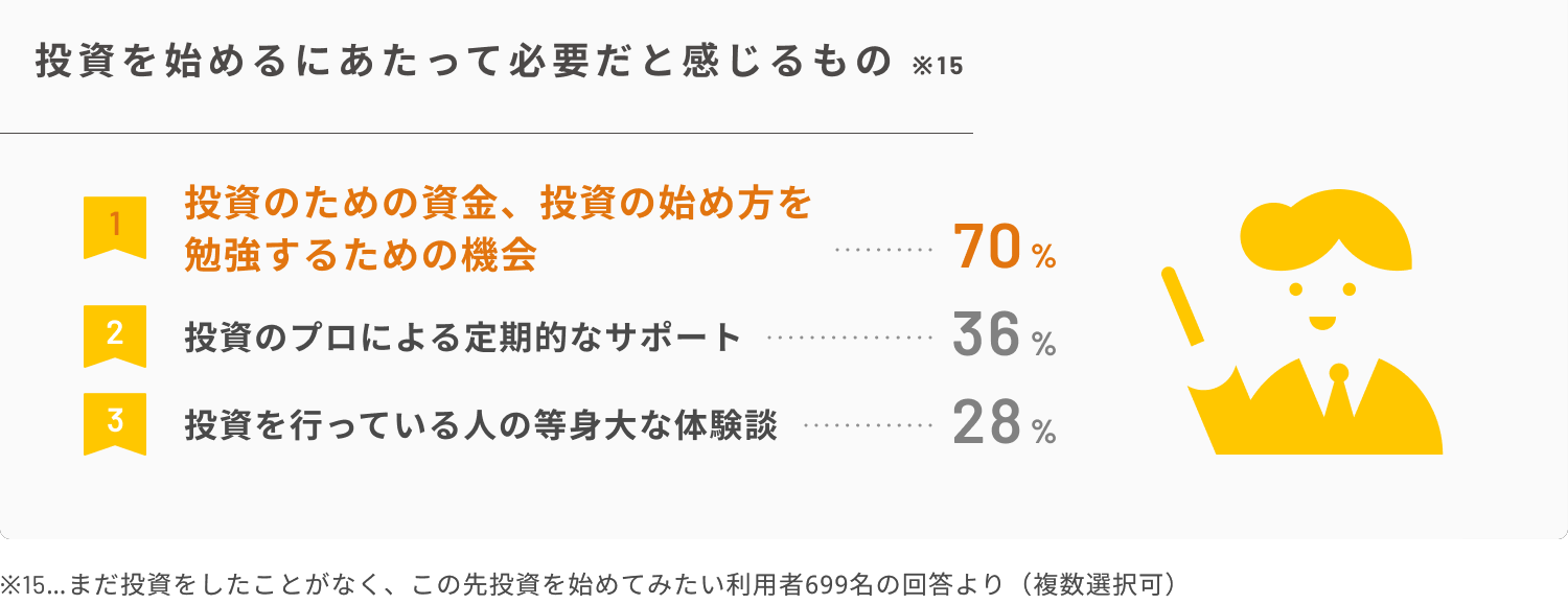 ・投資を始めるにあたって必要だと感じるのは、1位「投資のための資金、投資の始め方を勉強するための機会」、2位「投資のプロによる定期的なサポート」、3位「投資を行っている人の等身大な体験談」。