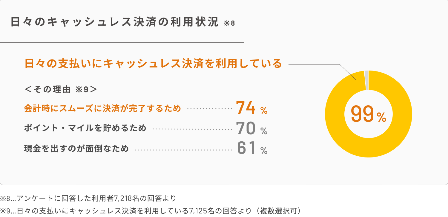 ・日々の支払いにキャッシュレス決済を利用しているのは全体の99%。その理由の上位は「会計時にスムーズに決済が完了するため」、「ポイント・マイルを貯めるため」、「現金を出すのが面倒なため」。