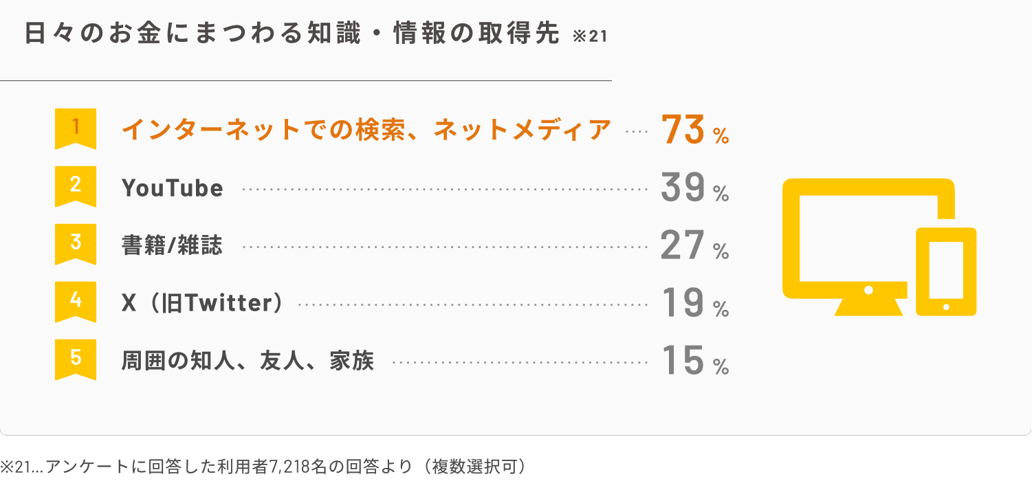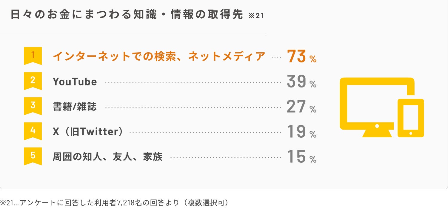 ・日々のお金にまつわる知識・情報の取得先の上位3つは、「インターネットでの検索、ネットメディア」「YouTube」「書籍・雑誌」「X(旧Twitter)」「周囲の知人、友人、家族」。