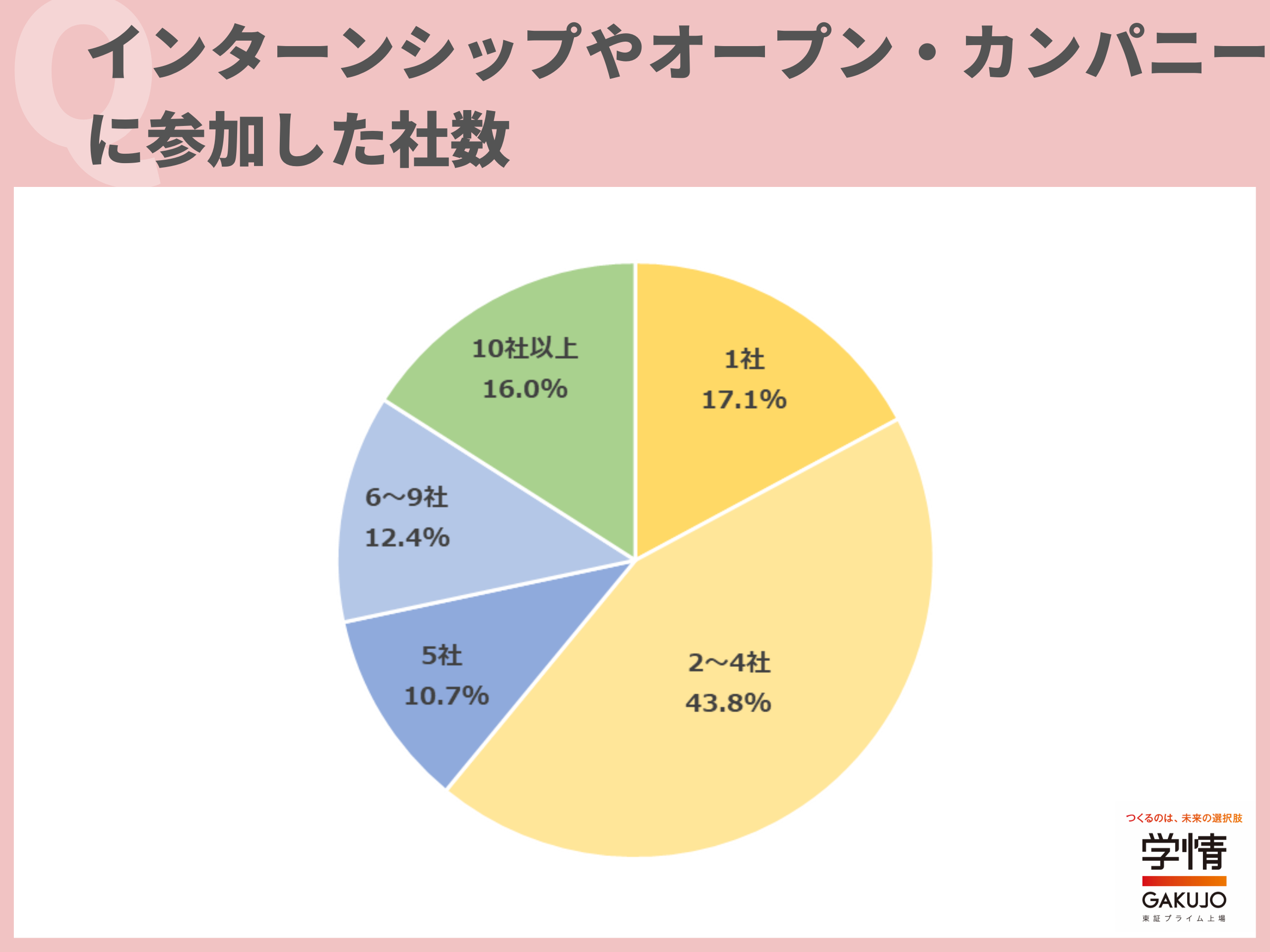 インターンシップやオープン・カンパニーに参加した社数は「2~4社」が43.8%で最多。「10社以上」の回答は16.0%、「5社以上」は39.1%となりました。「実際に仕事を体験できるインターンシップは参加してよかった」「職場体験ができるプログラムと、グループワークのみのプログラムでは満足度も理解度も格段に違った」「インターンシップに実際に参加することで、Webで調べるだけでは分からないリアルを知ることができた」「仕事の面白さも大変さも体験できるインターンシップは、企業や仕事への理解を深めることができた」といった声が寄せられました。