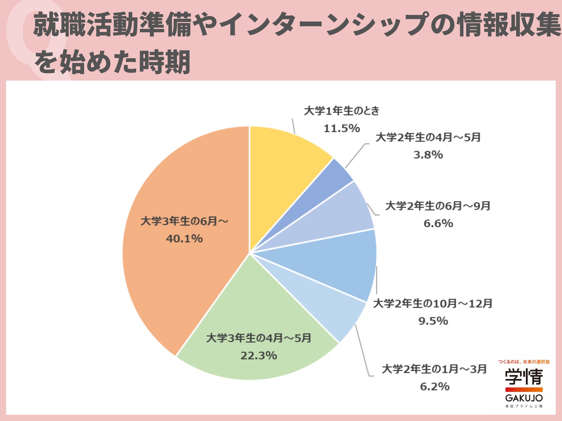 就職活動準備やインターンシップの情報収集を始めた時期は「大学3年生の6月~」が40.1%で最多。次いで、「大学3年生の4月~5月」22.3%が続きました。「大学1年生」11.5%、「大学2年生」26.1%となっており、4割に迫る学生が大学1・2年生のときから、インターンシップの情報収集を開始していることが分かります。
