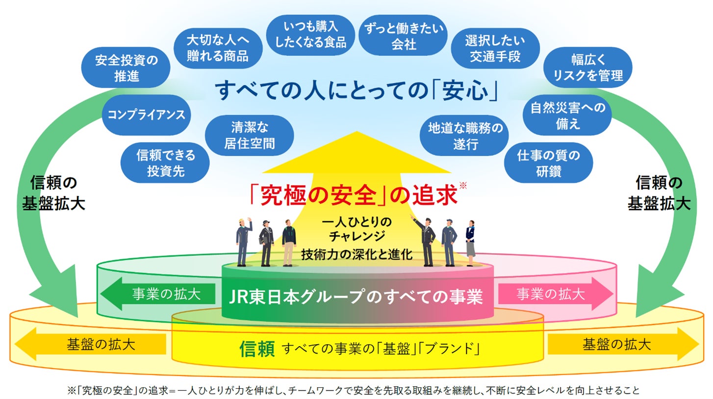 JR東日本グループは、「究極の安全」の追求を経営のトッププライオリティとして堅持し、鉄道輸送をはじめとした商品・サービスの品質を高め、すべての人に「安心」を感じていただくことをめざします。これにより、すべての事業の基盤となる「信頼」を拡大させていきます。