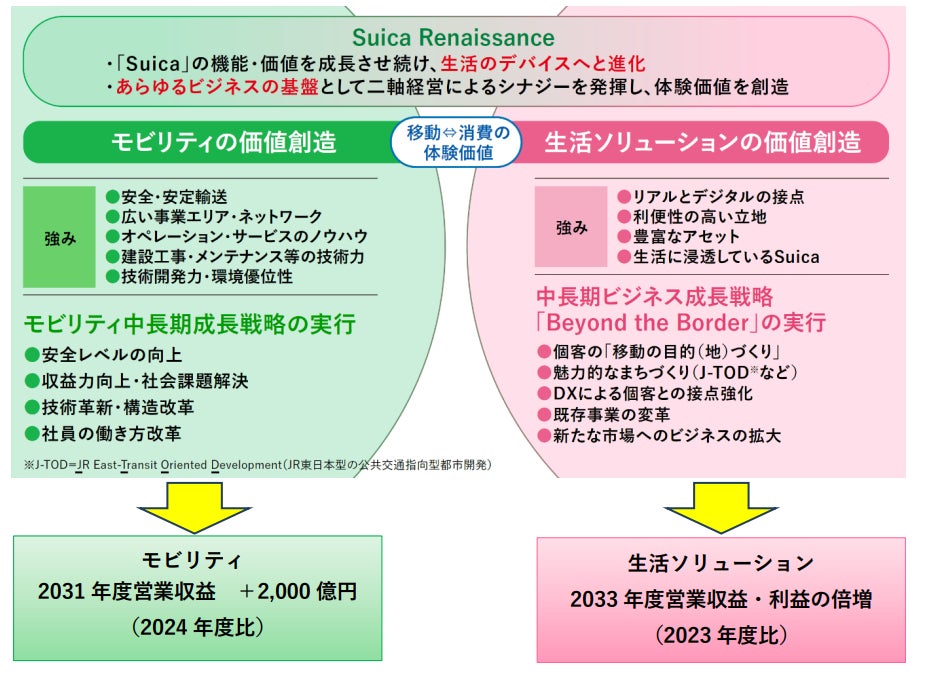 2025年秋に発表予定の「モビリティ中長期戦略」と、2024年6月に発表した生活ソリューションの中長期ビジネス成長戦略「Beyond the Border」のもと、モビリティと生活ソリューションそれぞれで強みを活かした成長戦略を推進します。そして、「Suica Renaissance構想」のもと、Suicaをあらゆるビジネスの基盤として進化させ、統一されたIDと合わせ、「Suica生活圏」を構築していきます。
