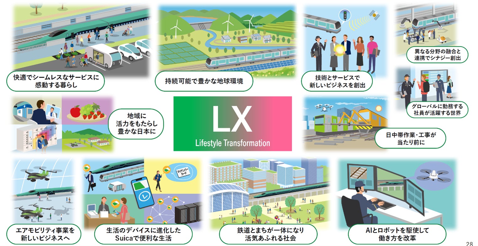 「勇翔2034」で創造する価値は、ライフスタイル・トランスフォーメーション(LX)です。JR東日本グループは、社会課題や潜在ニーズに向き合い、お客さま・地域の皆さまの生活様式と社員の働き方を革新していきます。そして、思いやりとワクワクにあふれる社会を創り、新たな未来をデザインします。