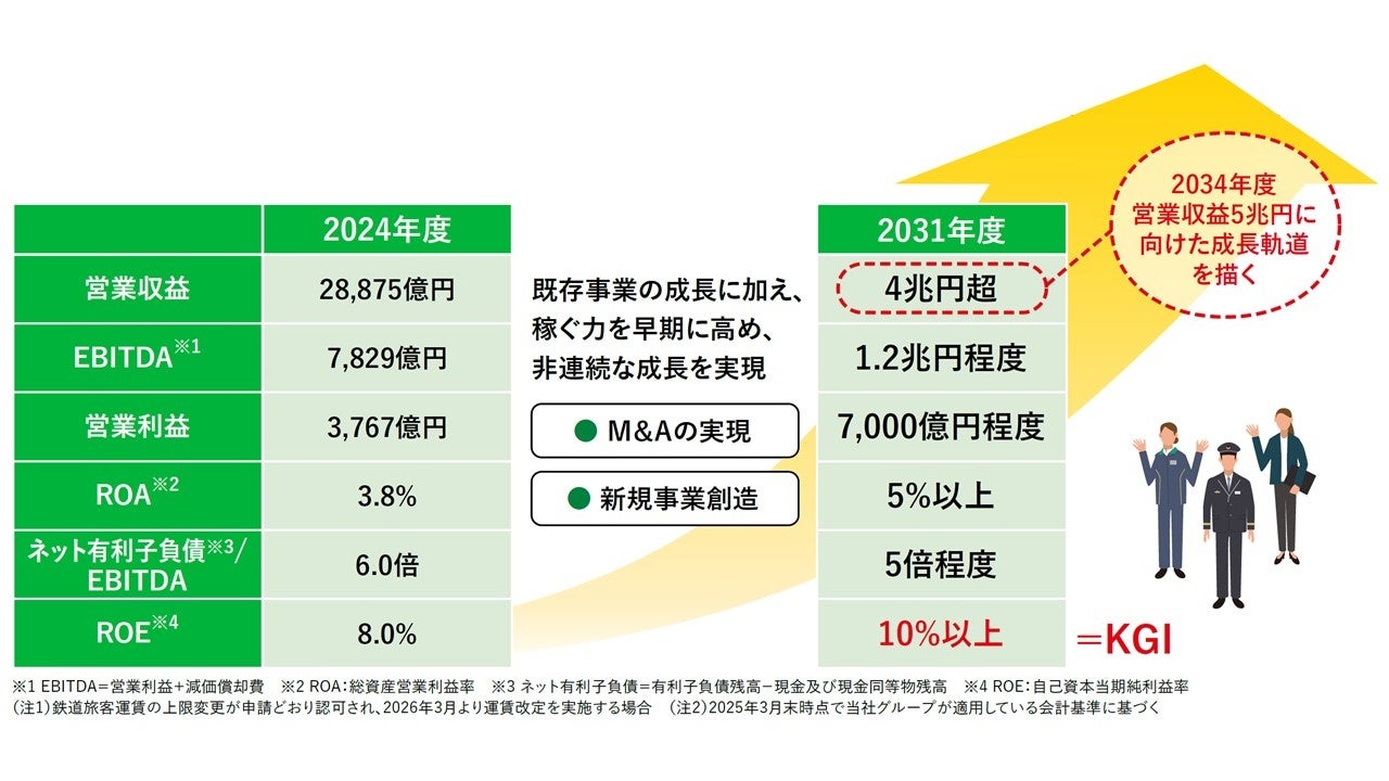 「勇翔2034」のKGI [Key Goal Indicator](長期的な経営目標)として、「2031年度ROE10%以上」を掲げます。既存事業の成長と非連続な成長を通じて2031年度の営業収益4兆円超をめざし、5兆円の営業収益規模(2034年度)に向けた成長軌道を描きます。