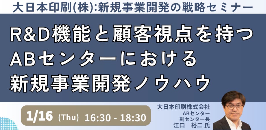 JPI(日本計画研究所)は、大日本印刷株式会社 ABセンター 副センター長 江口 裕二 氏を招聘し、R&D機能と顧客視点を持つABセンターにおける新規事業開発ノウハウについて詳説いただくセミナーを開催します。
