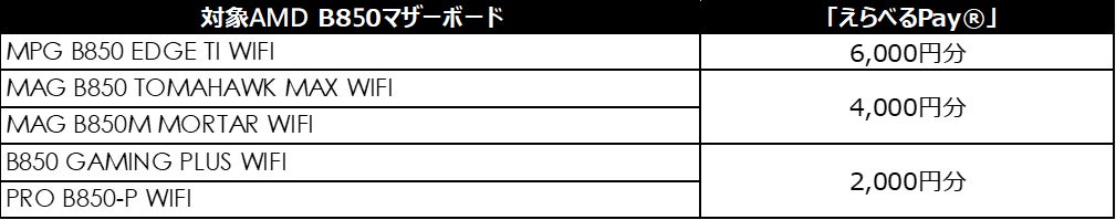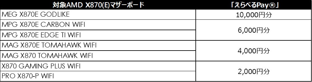 対象MSI X870(E)B850マザーボードを購入すると最大10,000円分の「えらべるPay®」をプレゼント~2025年4月28日(月)より開始~