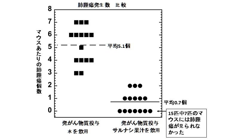 - マウス肺発癌実験で、サルナシ果汁成分を水代わりに飲ませていたマウスでは、水を飲ませていたマウスには同じ量の発がん物質を投与すると100%肺がん発症する条件でも、悪性腫瘍数は有意に少なく、約半数のマウスには悪性腫瘍は見られませんでした。