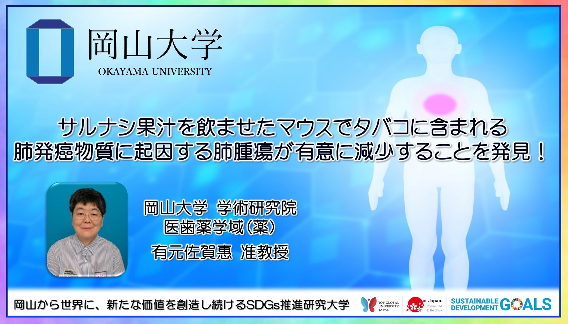 国立大学法人岡山大学(本部:岡山市北区津島中、学長:槇野博史)学術研究院医歯薬学域(薬)の有元佐賀惠准教授は、マウス肺癌モデルにて、サルナシ果汁をマウスに水代わりに飲ませておくと、肺発癌物質による肺悪性腫瘍の発症数が有意に減少し、うち約半数(15匹中7匹)のマウスには悪性腫瘍が発生しなかったことを明らかにしました。