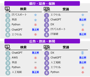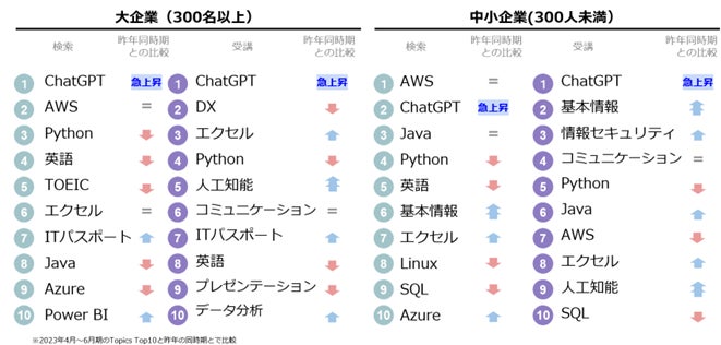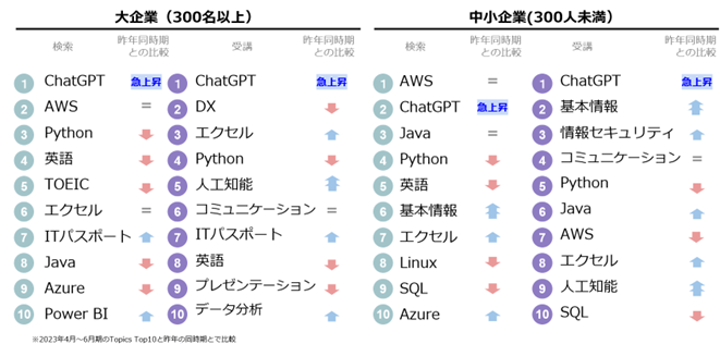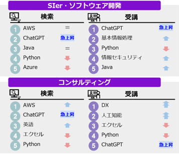 ChatGPTのニーズが急上昇し、相対的にPythonやAzureのニーズが落ち着いた。受講動向では情報処理試験関連・情報セキュリティ・Javaの受講傾向が高まった。