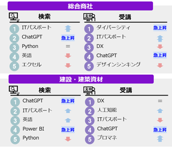 ITパスポートや英語の学習ニーズが高まった。またPowerBIのニーズが急上昇した。受講動向では、ChatGPTと連動した人工知能の受講が高まっている。プロジェクトマネジメントも大きく上昇している。