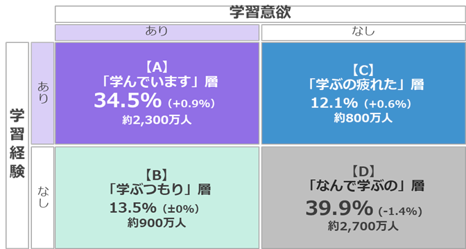 また、学習経験も今後の学習意欲もある『学習し続けている層(※図表内「学んでいます」層)』は社会人の約35%いるものの、社会人の約40%が、学習経験も今後の学習意欲もない『学習意欲なし層(※図表内「なんで学ぶの」層)』であることが分かりました。