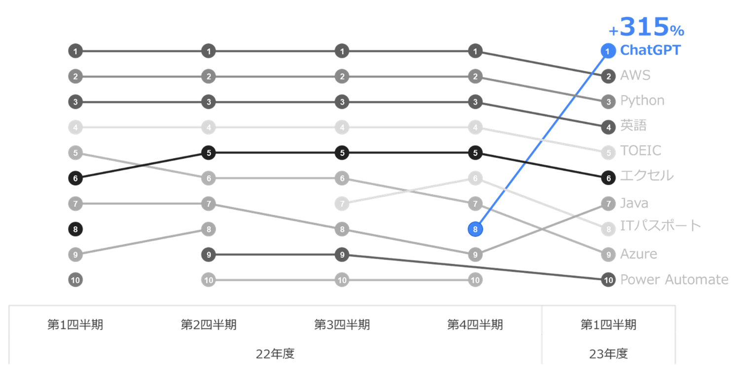 Python の人気が引き続き高い傾向にある。Power Automateの学習ニーズが高まっている。受講動向では、英語が高まっているのと同時にChatGPTと連動した人工知能が大幅に高まっている。