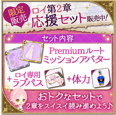 ロイ本編ストーリー第2章のミッションアバターとロイ専用ラブパス、体力が入ったお得なセットを販売しております。