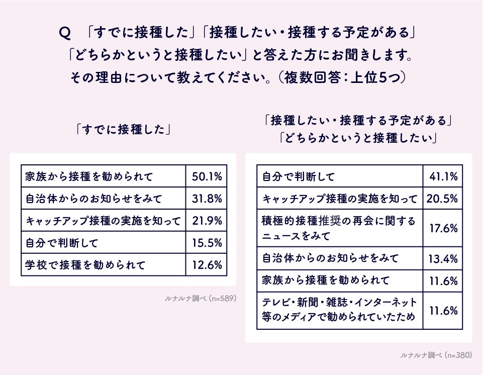 「すでに接種した」と回答した人に、接種しようと思った理由を聞いたところ、「家族から接種を勧められて」を選択した人が50.1%で最多、次いで「自治体からのお知らせをみて」31.8%、「キャッチアップ接種の実施を知って」21.9%という結果でした。また「接種したい・接種する予定がある」「どちらかというと接種したい」と回答した人の理由として最も多かったのは、「自分で判断して」41.1%、次いで「キャッチアップ接種の実施を知って」20.5%、「積極的接種勧奨の再開に関するニュースをみて」17.6%となりました。安全性について特段の懸念が認められないことがあらためて確認されたことや、接種による有効性が副反応のリスクを明らかに上回ると認められたこと※6、公費として接種できて経済的に負担がかからないことなどが接種のきっかけとなっているのではないでしょうか。
