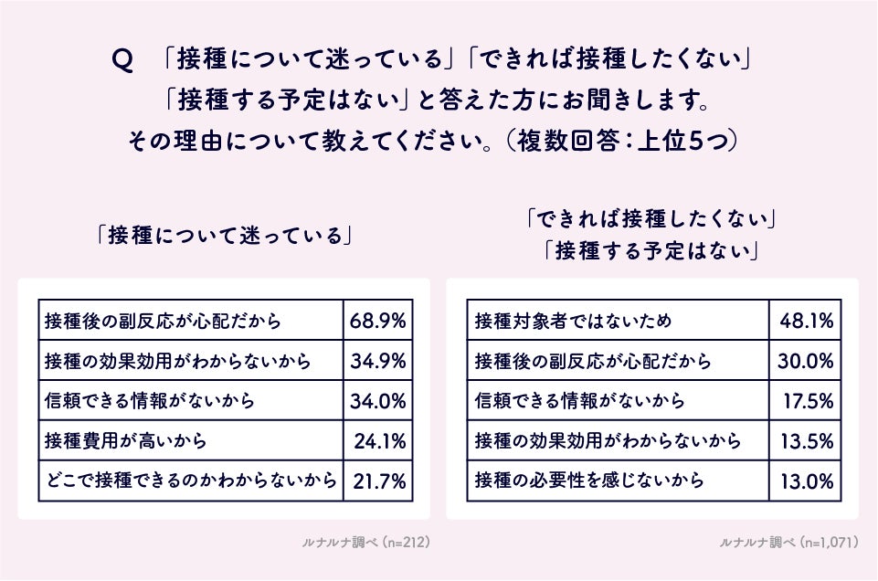 ■接種を迷っている・したくない理由では、副反応の心配や信頼できる情報がないとの声が多く・・・