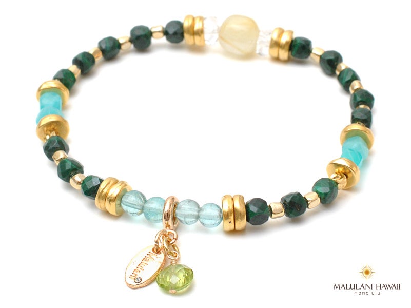 魔除けや健康のお守りとして名高いマラカイトをベースに、金運や良縁など、必要を満たすと伝えられるゴールデンルチルで組み上げた、頼もしさ満載のブレスレット。