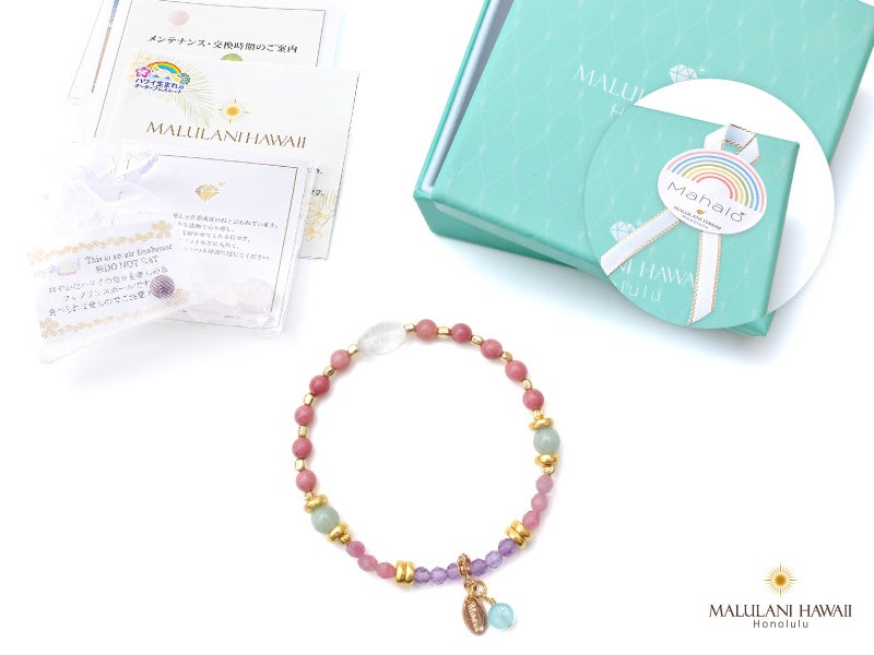オリジナルチャームと水晶には、ハワイ語で「神のご加護」を意味する「Malulani」と刻印。