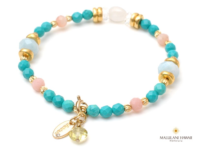 「身代わりになってでも持つ人を守る」と伝えられるターコイズをベースに、海の象徴アクアマリン、月の象徴ムーンストーンで組み上げた、明るく健やかなエネルギーのブレスレット。