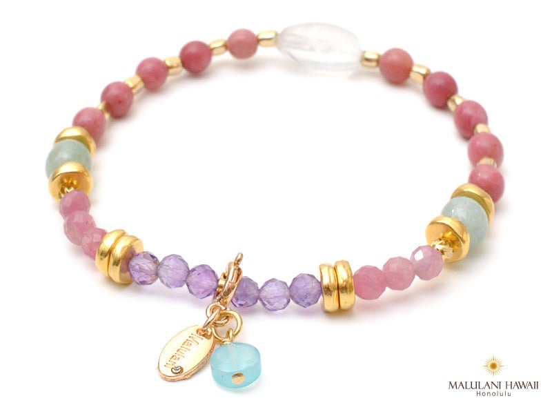 良縁や優美さをもたらすピンクトルマリン、穏やかなコミュニケーションをサポートするシーブルーカルセドニーをプラスし、毎日が喜びや豊かさで満たされるよう仕立てました。