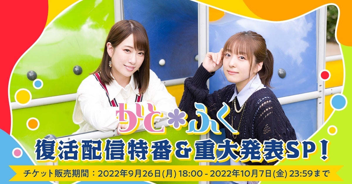 株式会社CyberZ(本社:東京都渋谷区、代表取締役社長:山内隆裕)が提供する動画配信プラットフォーム「OPENREC.tv」(オープンレックティービー)では、声優ユニット「かと*ふく」の6年ぶりの再始動の活動内容について発表予定の『かと*ふく 復活配信特番&重大発表SP!」を独占配信することをお知らせいたします。