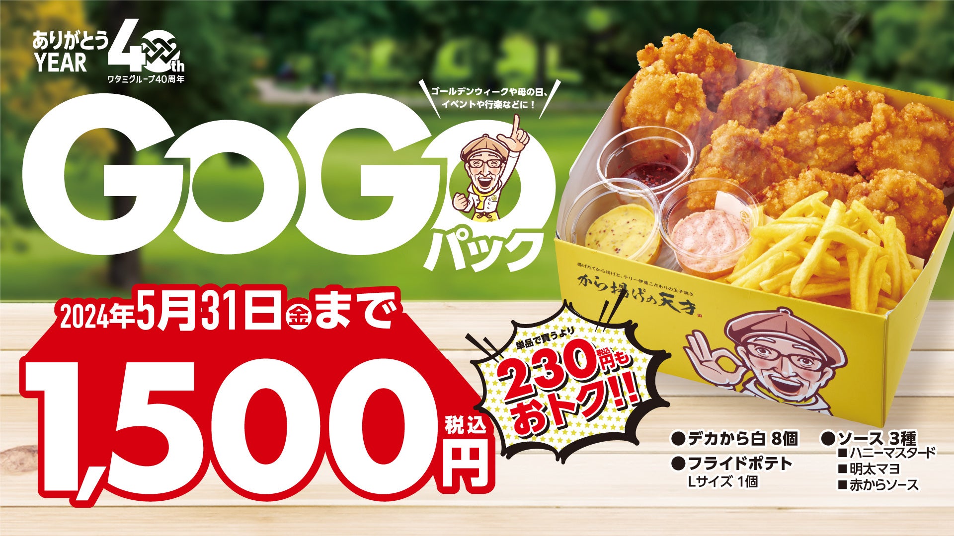 揚げたてから揚げとテリー伊藤こだわりの玉子焼き「から揚げの天才」は、2024年4月22日(月)から5月31日(金)の期間限定で1,730円(税込)相当のから揚げパックを230円お得な1500円(税込)で販売いたします。GWに一人でも多くの方が楽しく過ごせるようにと思い4月22日(月)から販売することにいたしました。GOGOパックは母の日などお家でのパーティーにも最適なから揚げパックで、デカから(白)8個、フライドポテト(L)1個、ディップソース3種(ハニーマスタード・明太マヨ・赤からソースの3種)入りで食べ応え十分です。お家での食事やおつまみにはもちろん、公園などの外出先でも食べやすいから揚げパックとなっております。この機会に是非ご賞味ください。