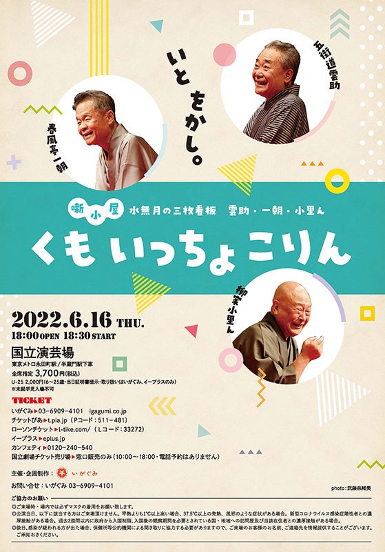 株式会社いがぐみ(東京都豊島区)主催、『《噺小屋》水無月の三枚看板 雲助・一朝・小里ん くもいっちょこりん』が2022年6月16日 (木)に国立演芸場(東京都千代田区)にて開催されます。チケットはカンフェティ(運営:ロングランプランニング株式会社、東京都新宿区、代表取締役:榑松 大剛)にて発売中です。