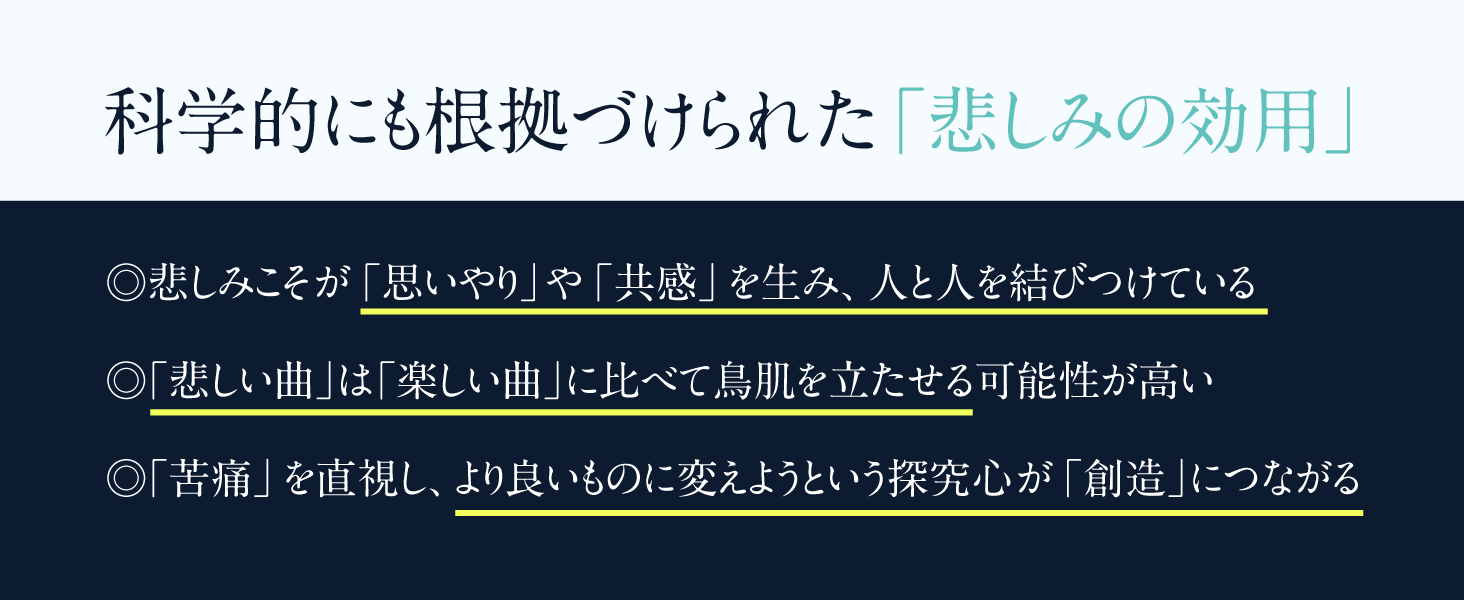 追い出すべき感情として考えられがちな「悲しみ」ですが、「悲しみ」の共有から「思いやり」や「人とのつながり」が生まれます。すべての感情の中で、「悲しみ」は最高の接着剤になるのです。