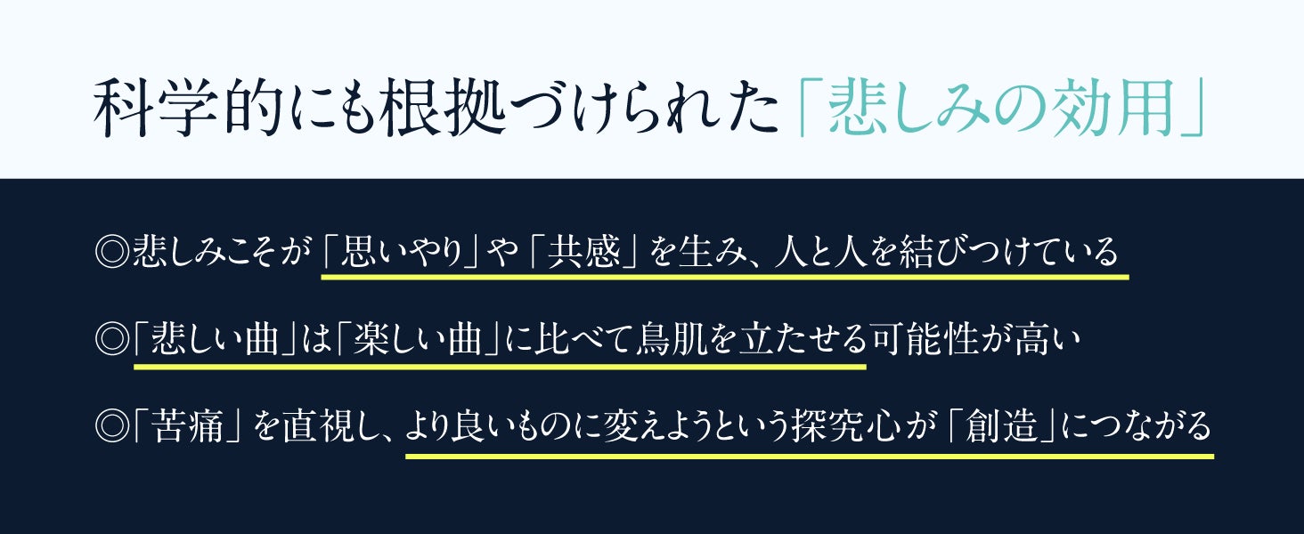 本書では、「悲しみ」や「切なる思い」の知られざる効力を豊富に紹介し、「悲しみ」や「切なる思い」を否定するような社会の中で、私たちがもっとうまく生きていく方法についてお伝えします。