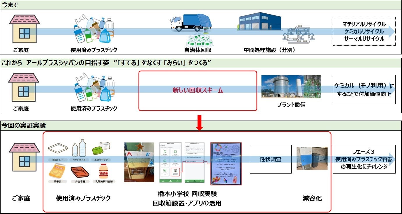 相模原市立橋本小学校では、“SDGsのまち HASHIMOTO”をスローガンに掲げ、6年生を対象に“SDGs教育”を実施。その一環として、今回の取り組みを行います。参加する各社による授業を受けたうえで、児童自らが回収箱を作成し、回収方法の考案や目標数値設定などを行いました。6月下旬に実施した仮回収結果を踏まえて方法を改善し、8月28日(月)から始まる本回収での回収量向上を図ります。回収したプラスチック容器の品質・量を調査、株式会社アールプラスジャパンが開発中のリサイクル技術への適用を検討することにより、将来的なプラスチック容器資源循環の可能性を探ります。なお、回収したプラスチックは、児童によるアイデアをもとにリサイクルし、再資源化して活用する計画です。