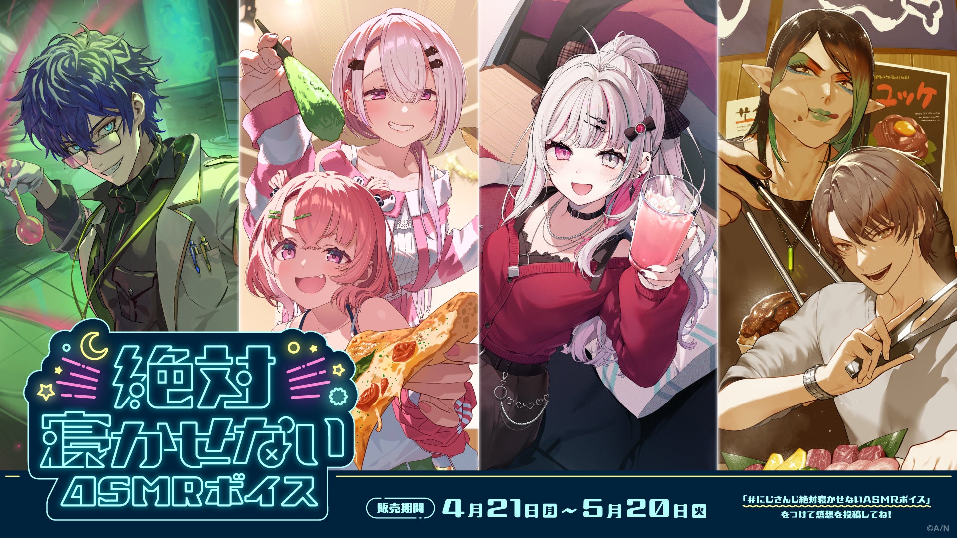 加賀美ハヤト、花畑チャイカ、笹木咲、椎名唯華、レオス・ヴィンセント、石神のぞみによる「絶対寝かせないASMRボイス」は、にじさんじオフィシャルストア(https://shop.nijisanji.jp)と、NIJISANJI EN Official Store(https://nijisanji-store.com)にて2025年4月21日(月)11時から2025年5月20日(火)23時59分までの期間販売をいたします。