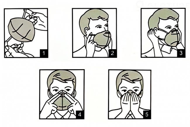 粉塵や飛沫を防ぐために口と鼻を覆うように、隙間無くしっかりと顔に密着させて下さい。