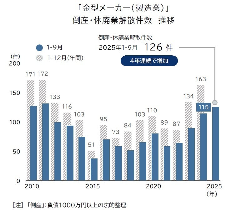 日本の「モノづくり産業」を黒子として支える金型産業で、市場から退出する企業が増加している。2025年1-9月に発生した「金型メーカー」の倒産(負債1000万円以上、法的整理)は36件、休廃業・解散(以下、「廃業」)が90件発生し、合計で126件が市場から退出した。倒産、廃業ともに過去10年で最多ペースとなったほか、前年同期比で4年連続の増加となるなど、製造業の空洞化が加速したリーマン・ショック以来の淘汰が進んでいる。