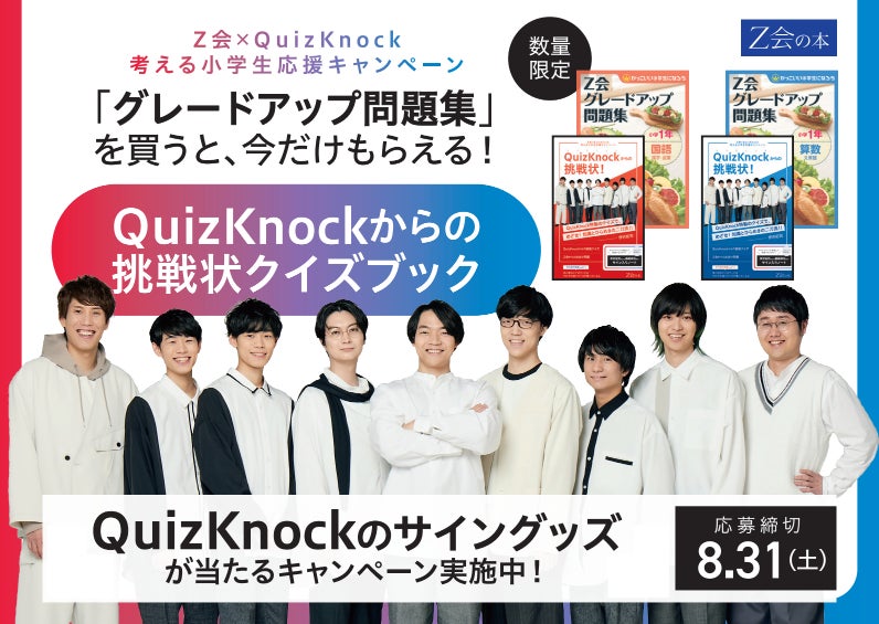 株式会社増進会ホールディングス(Z会グループ)のグループ会社、株式会社Z会ソリューションズは、株式会社batonが運営する東大発の知識集団「QuizKnock」と協力して、夏休みにがんばる小学生を応援するキャンペーンを実施します。キャンペーン帯が巻かれたZ会の小学生向け書籍を購入いただいた方には、オリジナルグッズを提供いたします。また、購入者限定で、QuizKnockのサイングッズが抽選であたるキャンペーンも実施!ぜひふるってご参加ください。