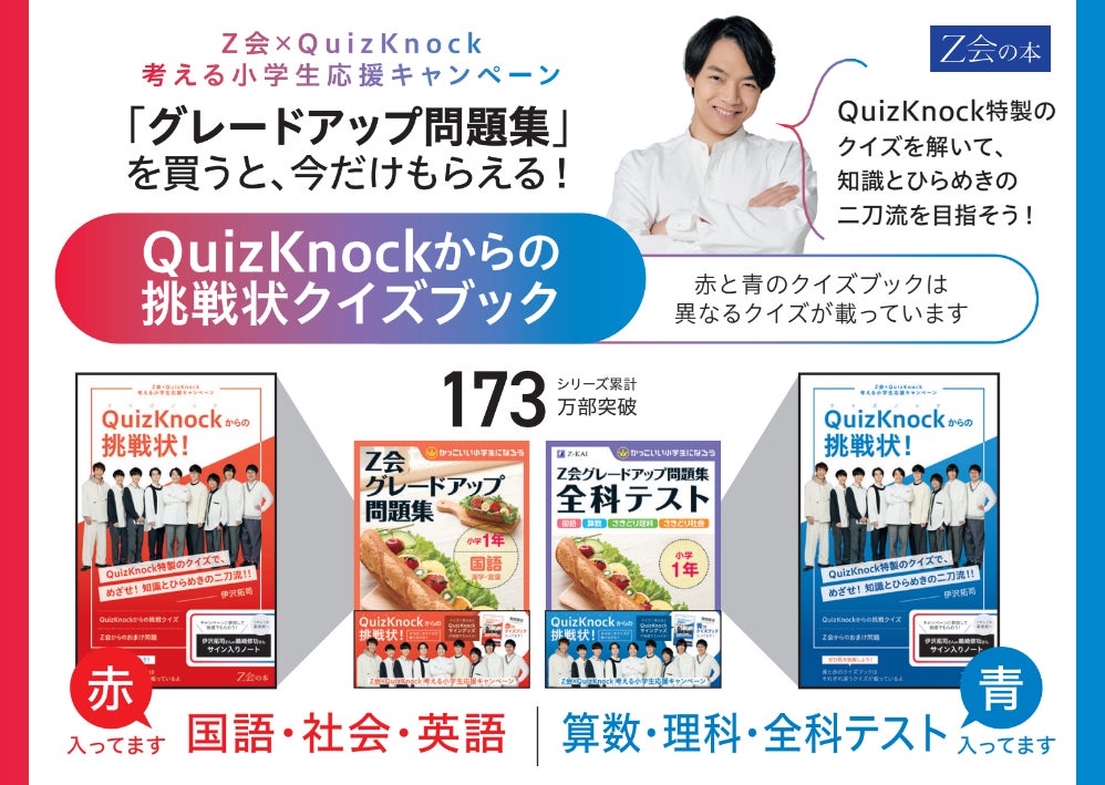 Z会の小学生向け問題集「グレードアップ問題集」シリーズを対象書店にてご購入いただくと、赤もしくは青の「QuizKnockからの挑戦状クイズブック」がもらえます!