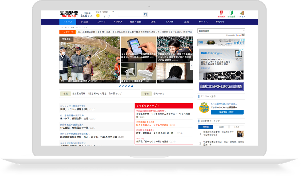 また、インターネットの普及・利用拡大に合わせ、ニュースサイト「愛媛新聞ONLINE」の開設、有料電子版の創刊のほか、「愛媛の経済サイトE4」サービスを始めるなど、デジタルでの情報発信・流通による県民の利便性向上にも注力しています。