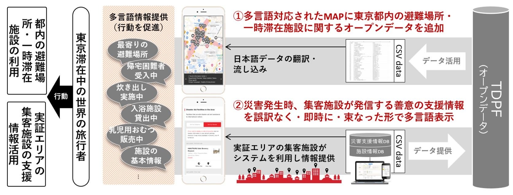 本プロジェクトは、大規模災害が多発した2018年の翌年、2019年7月に「LIVE JAPAN」からリリースされた、支援情報(災害時の支援情報項目)を提供する「災害情報タイムライン」の仕組みを活用し、施設からの災害情報を多言語で情報発信するサポートや、東京都が提供する避難場所・一時滞在施設のオープンデータを収集し、「LIVE JAPAN」内コンテンツの「便利MAP(※2)」で表示させるなどデータを活用することで、訪日外国人旅行者の安全・安心確保や民間ビジネスの活性化、都民のQOL向上に寄与することを目的としています。