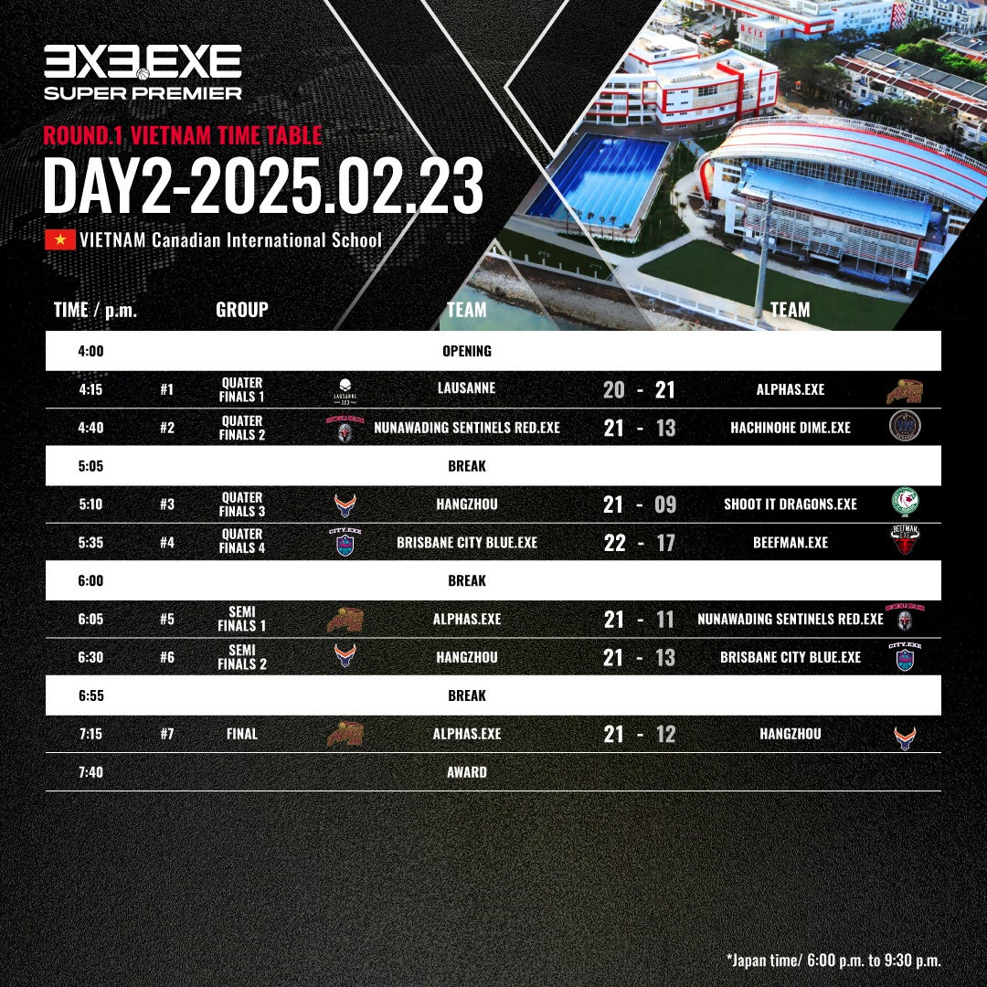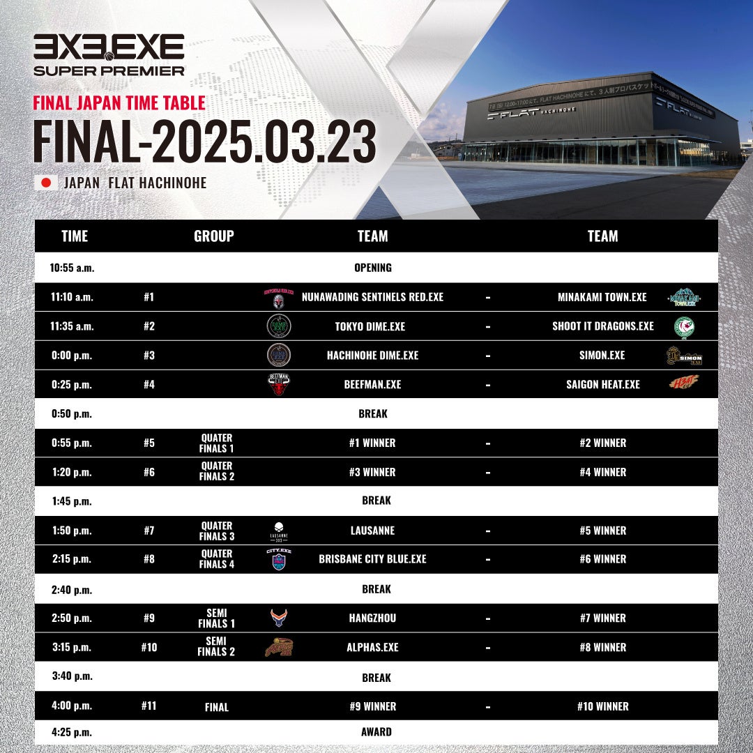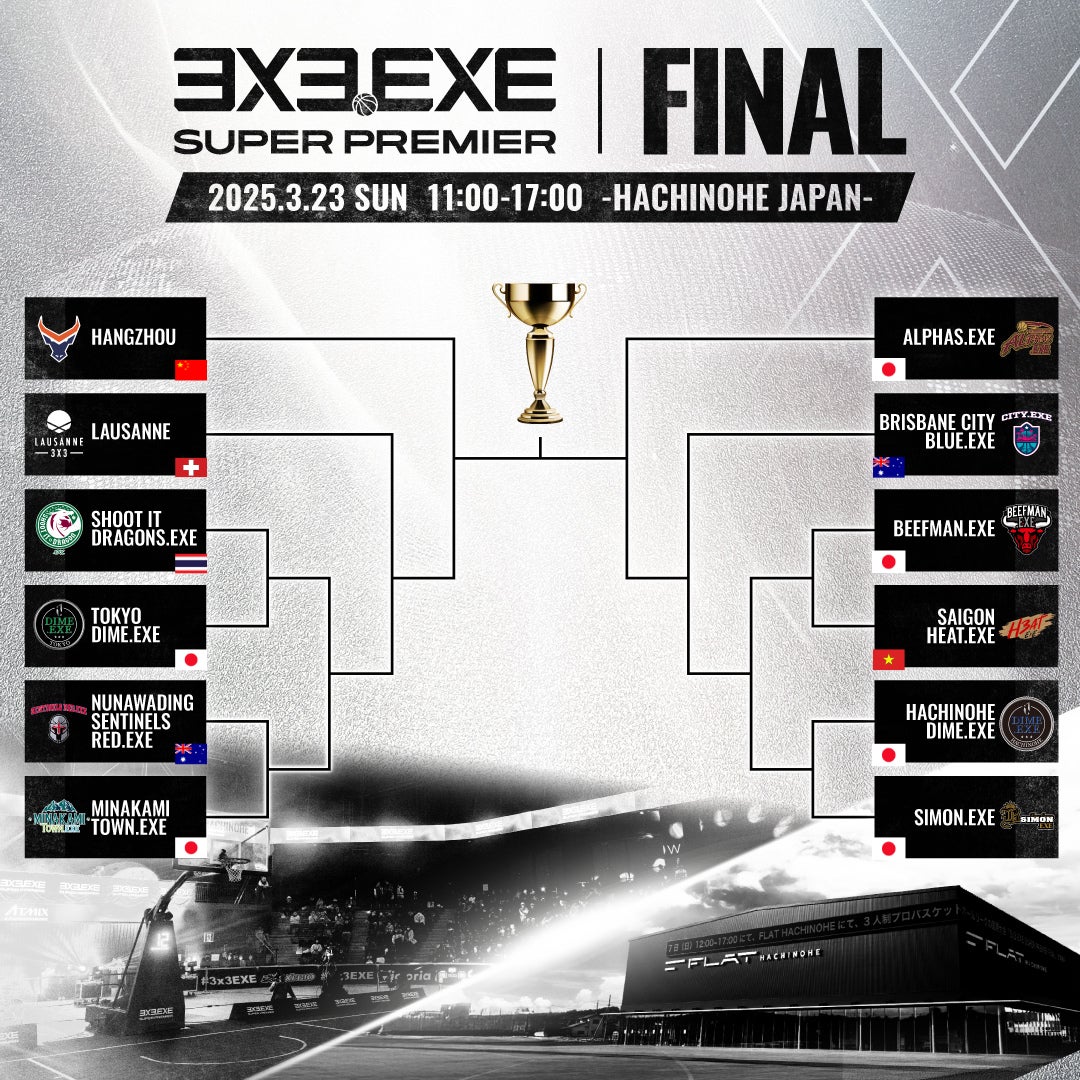 日本の八戸市(FLAT HACHINOHE)で開催される『3x3.EXE SUPER PREMIER 2025 FINAL』は、3/23(日)に単日で、一発勝負のトーナメント方式で開催されます。