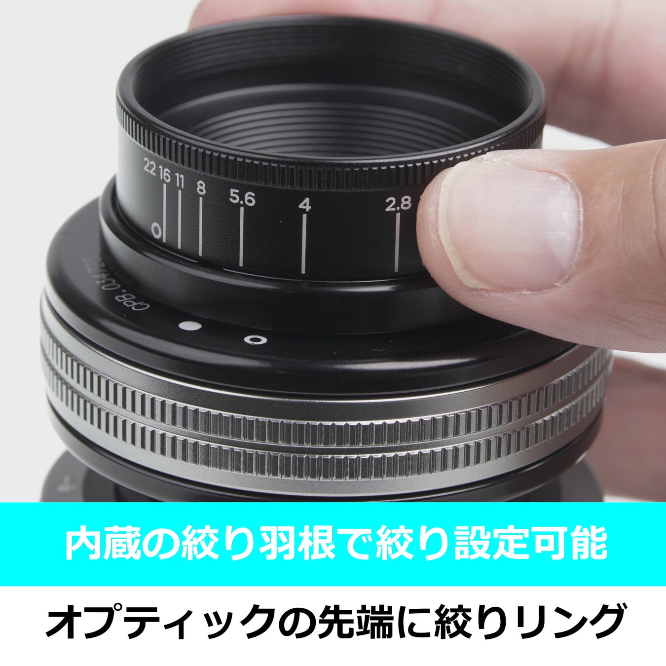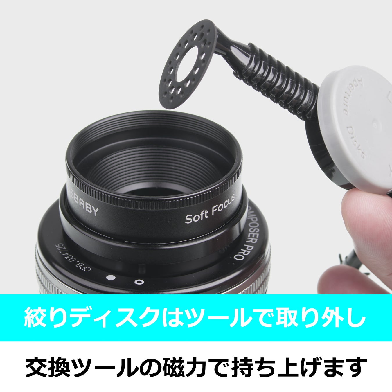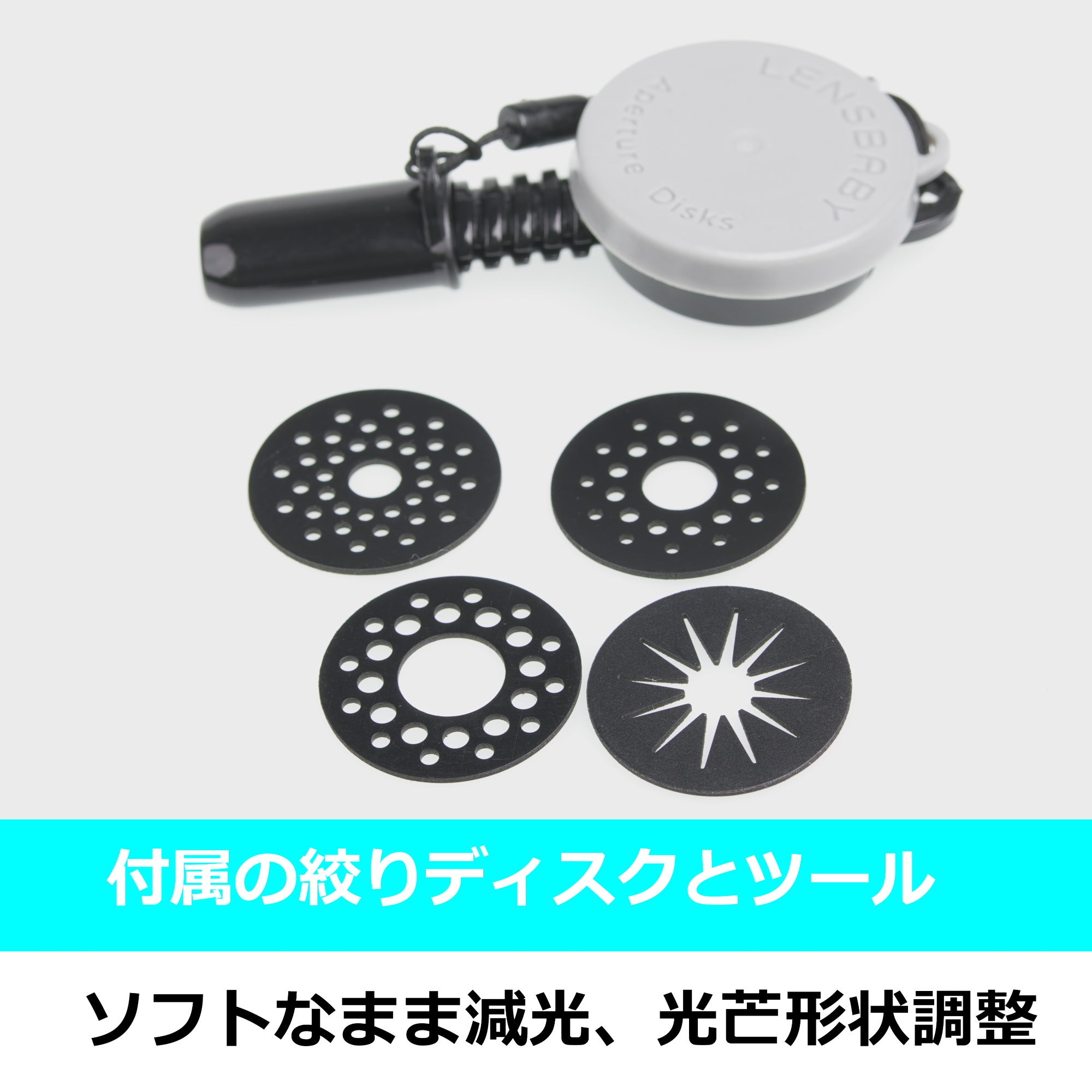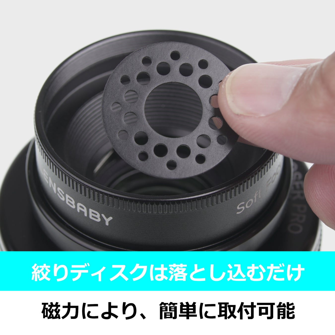 レンズ側の絞りリング(F2.5-22)に加え、4種類の絞りディスクにより、ボケの形状やソフト効果の調整(光量を少なくしながらも収差を補正しないように調整する)が可能です。