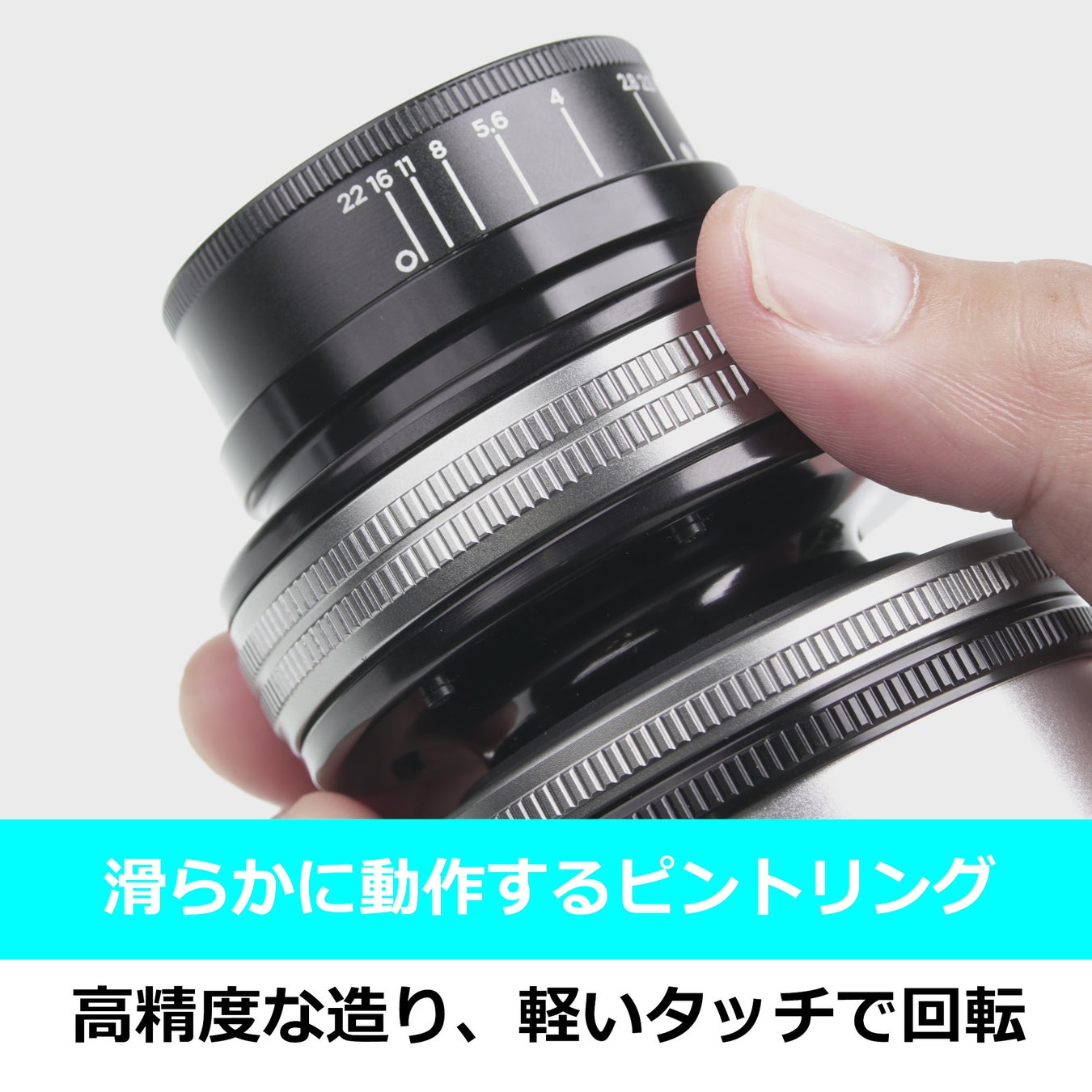 ピントリングは軽いタッチで滑らかに回転。写真撮影の精密なピント合わせの他、動画での表現にも役立ちます。