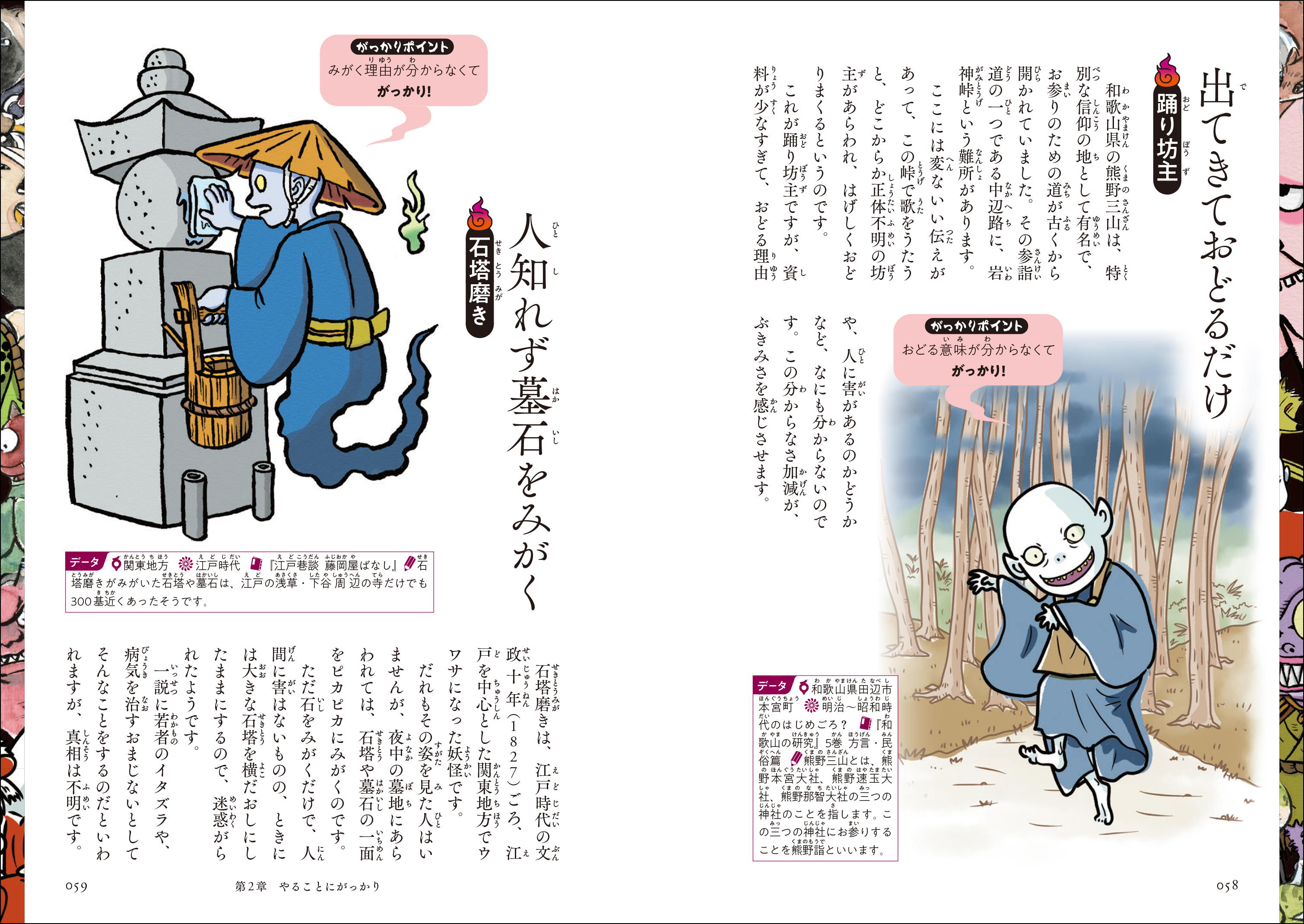 イラストと解説で1~2頁で1体を紹介する図鑑形式。小学生から読める総ルビ仕様。しかも、民話・伝承好きの大人も欲しくなる貴重な情報も満載!