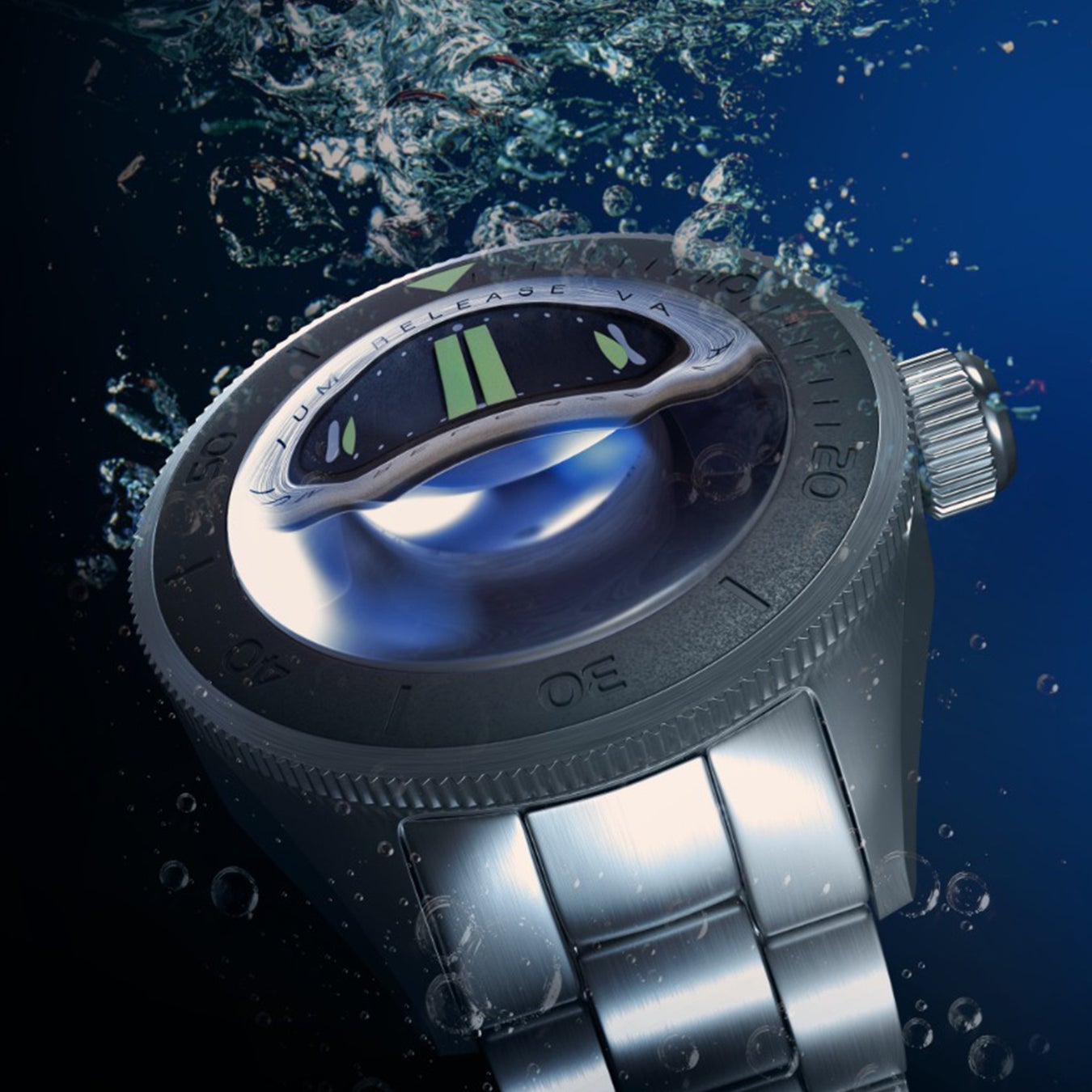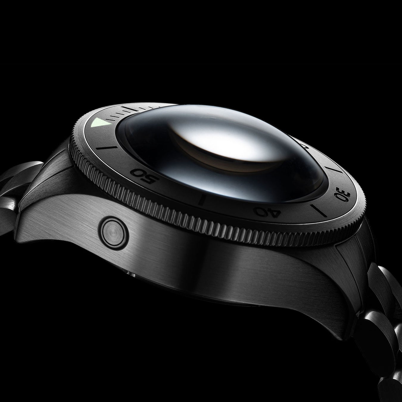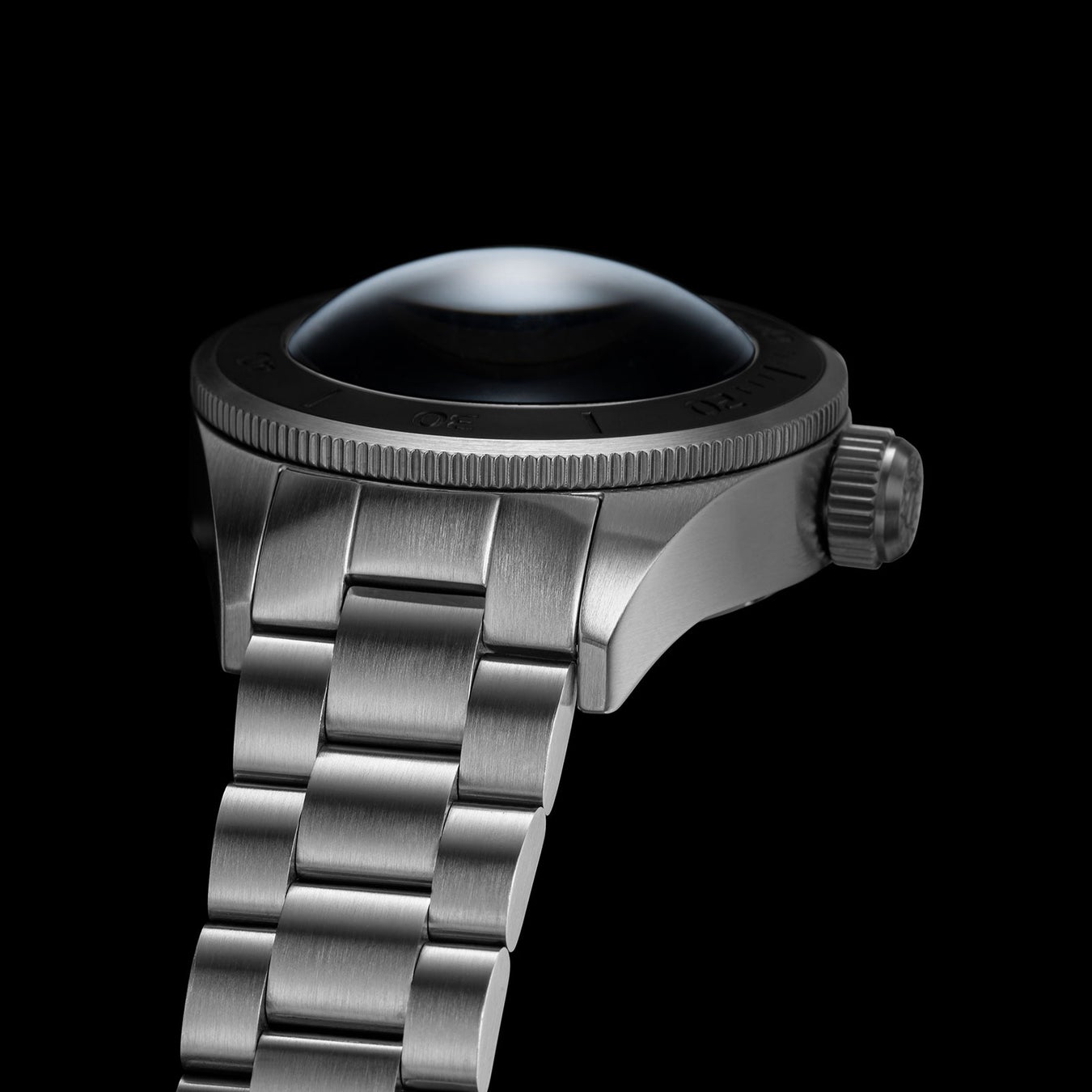 丸みを帯びたドーム型の無反射コーティングサファイアクリスタルレンズを採用した、ユニークなフォルムが印象的。潜水艦をイメージしたデザインは、腕時計自体を象徴するデザインにまとまり、着用時には腕元の存在感を高めてくれます。