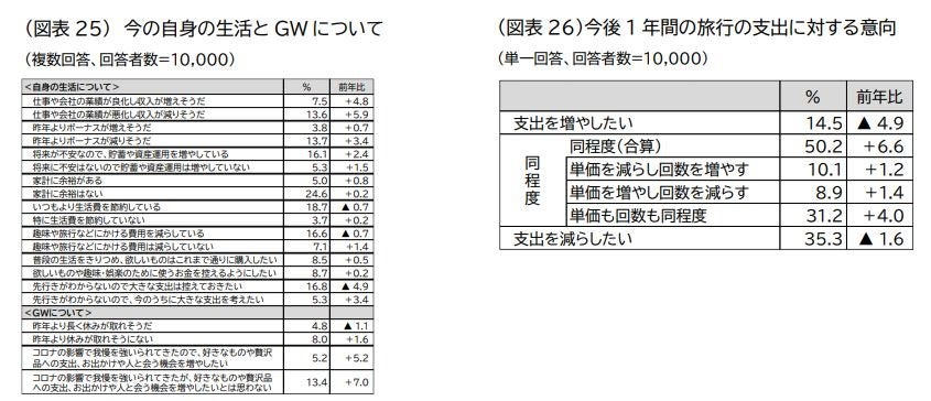 JTBが実施したアンケートで、生活とGWの旅行について当てはまる状況を聞いたところ、「仕事や会社の業績が悪化し収入が減りそうだ(13.6%)」の前年比伸び率は「仕事や会社の業績が良化し収入が増えそうだ(7.5%)」の同伸び率より高く、所得の厳しい状況がうかがえます。その一方で、「家計に余裕がある(5.0%)」の同伸び率は「家計に余裕はない(24.6%)」の同伸び率よりも高く、若干ながら余裕が出てきているようです。そのようななか、「趣味や旅行などにかける費用を減らしている(16.6%)」は前年から減少、「趣味や旅行などにかける費用は減らしていない(7.1%)」は増加となっており、また「先行きがわからないので大きな支出は控えておきたい(16.8%)」が前年から減少、「先行きがわからないので、今のうちに大きな支出を考えたい(5.3%)」が増加となるなど、趣味や旅行への出費を惜しまない様子がうかがえます(図表25)。