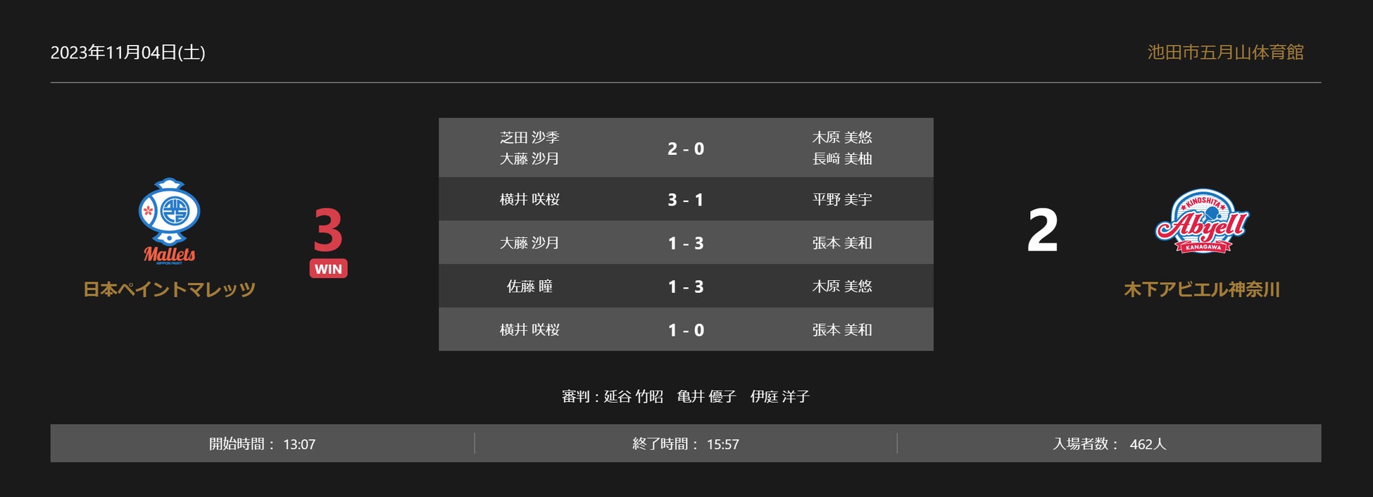 ノジマTリーグ 2023-2024シーズン 公式戦 11月4日開催の「日本ペイントマレッツ vs 木下アビエル神奈川」の試合は、3-2で日本ペイントマレッツが勝利しました。