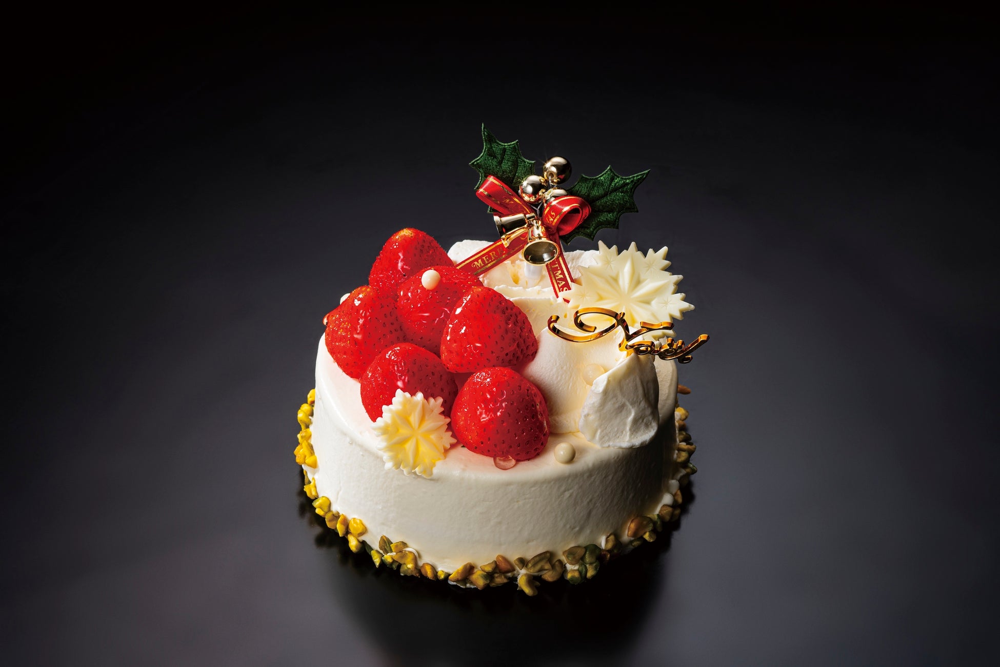 シャンティークリームとストロベリーのスライスがフワフワのスポンジにサンドされたクリスマスショートケーキ。雪の結晶を模ったホワイトチョコレートやピスタチオ、たっぷりのシャンティークリームに色鮮やかなストロベリーが映えるスタイリッシュなケーキです。