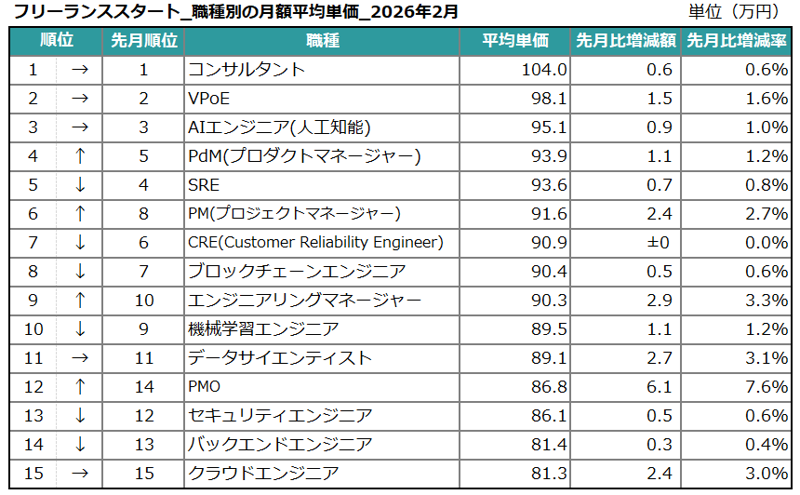 2026年2月度 フリーランスエンジニア月額平均単価79.9万円。職種別では「VPoE」の平均単価が2ヵ月連続上昇