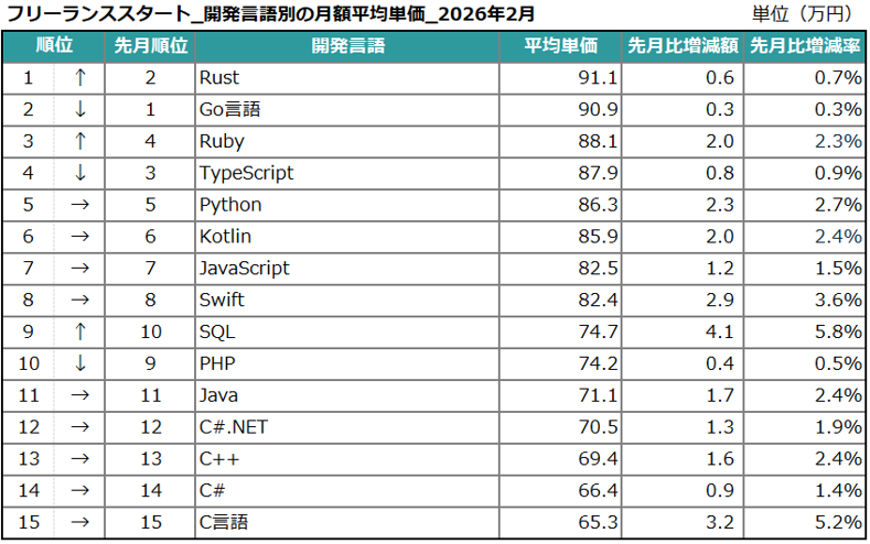 開発言語別では、2025年12月度に一度平均単価が下落していた「Rust」が、2月度には91.1万円(+0.6万円/0.7%増)と、再び上昇しました。高いパフォーマンスと安全性が求められる領域での活用が広がり、安定した需要につながっていることがうかがえます。