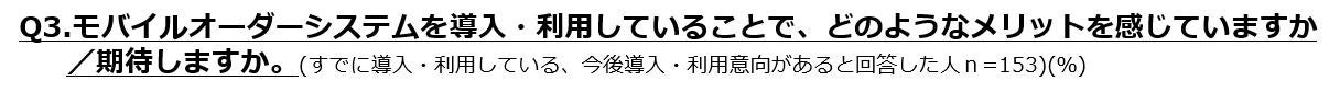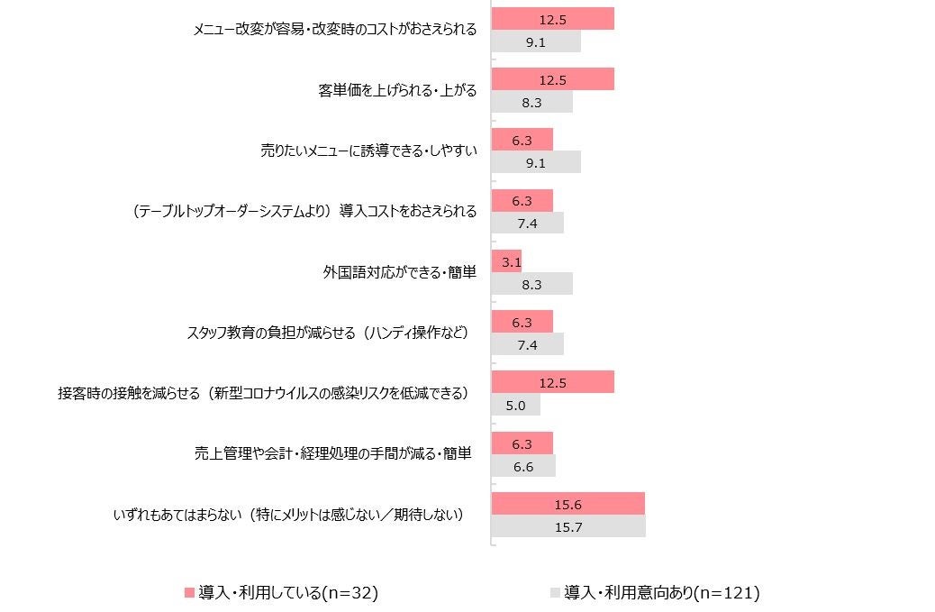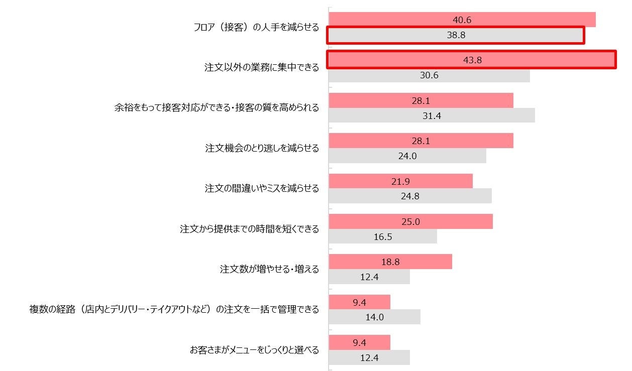 ・モバイルオーダーシステムをすでに導入・利用しているお店が実感しているメリットは、「注文以外の業務に集中できる」が43.8%で最多。今後導入・利用する意向があるお店が期待するメリットでは「フロアの人手を減らせる」が38.8%で最多。