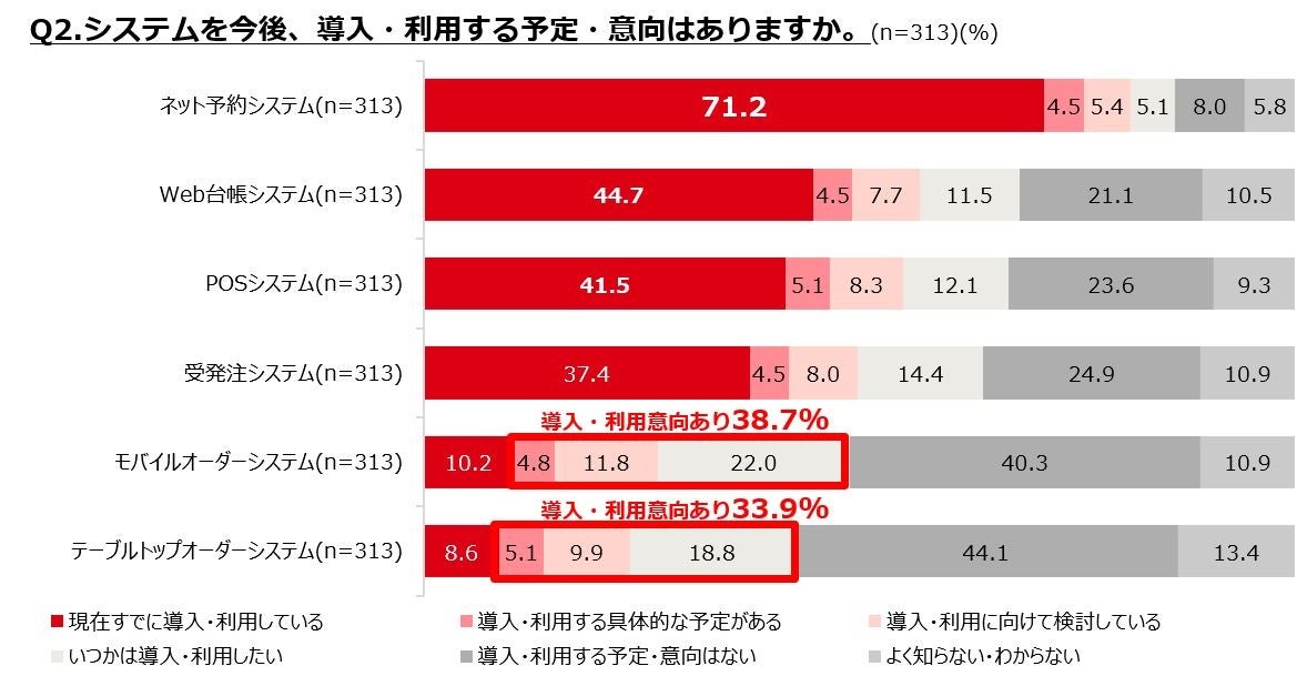 ・現在最も導入・利用されている分野は「ネット予約システム」で71.2%、今後の導入・利用意向は「モバイルオーダーシステム」が38.7%で最多。